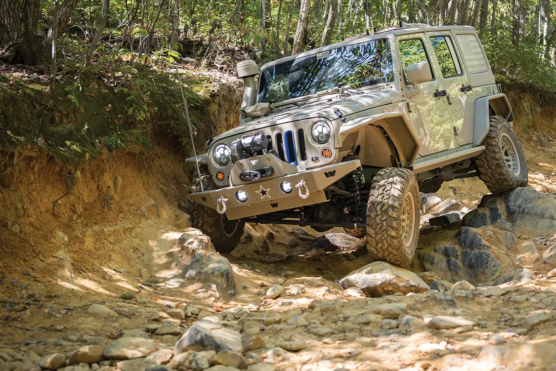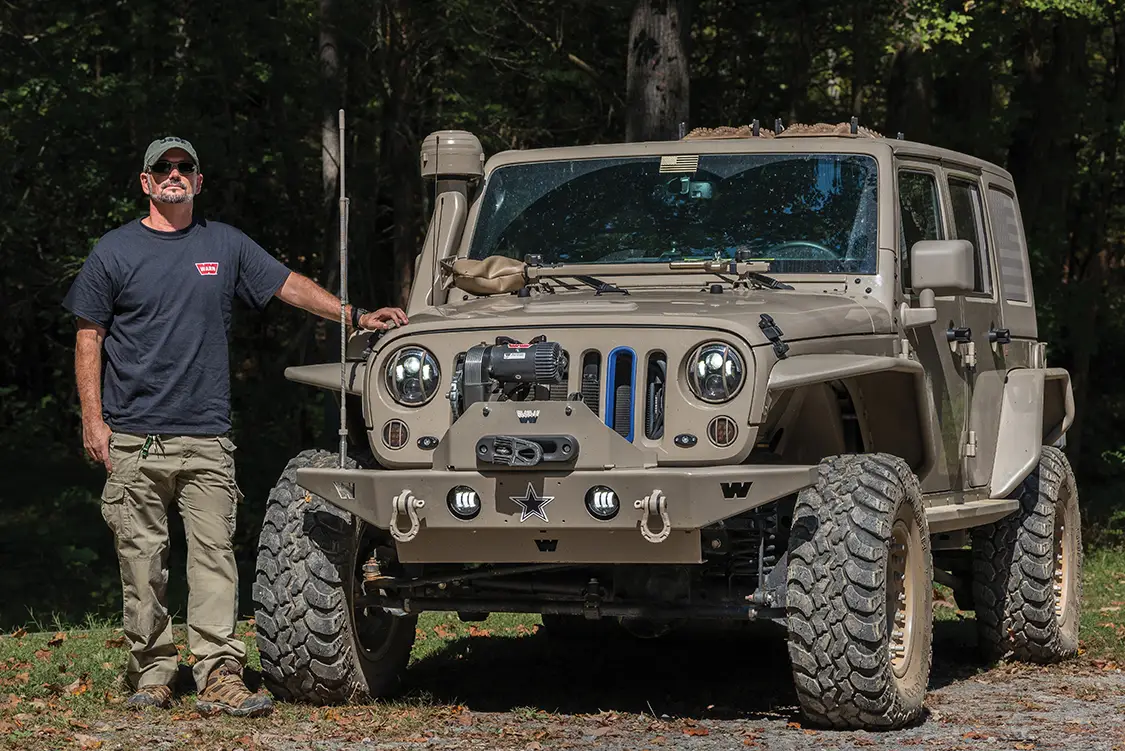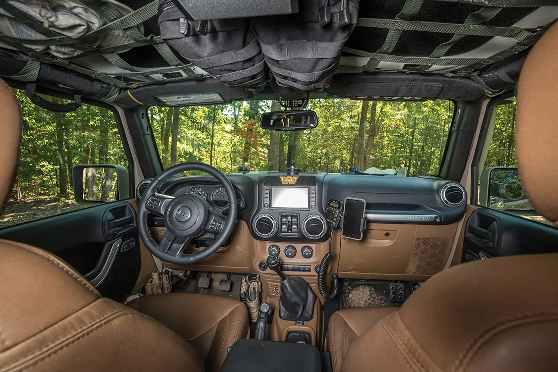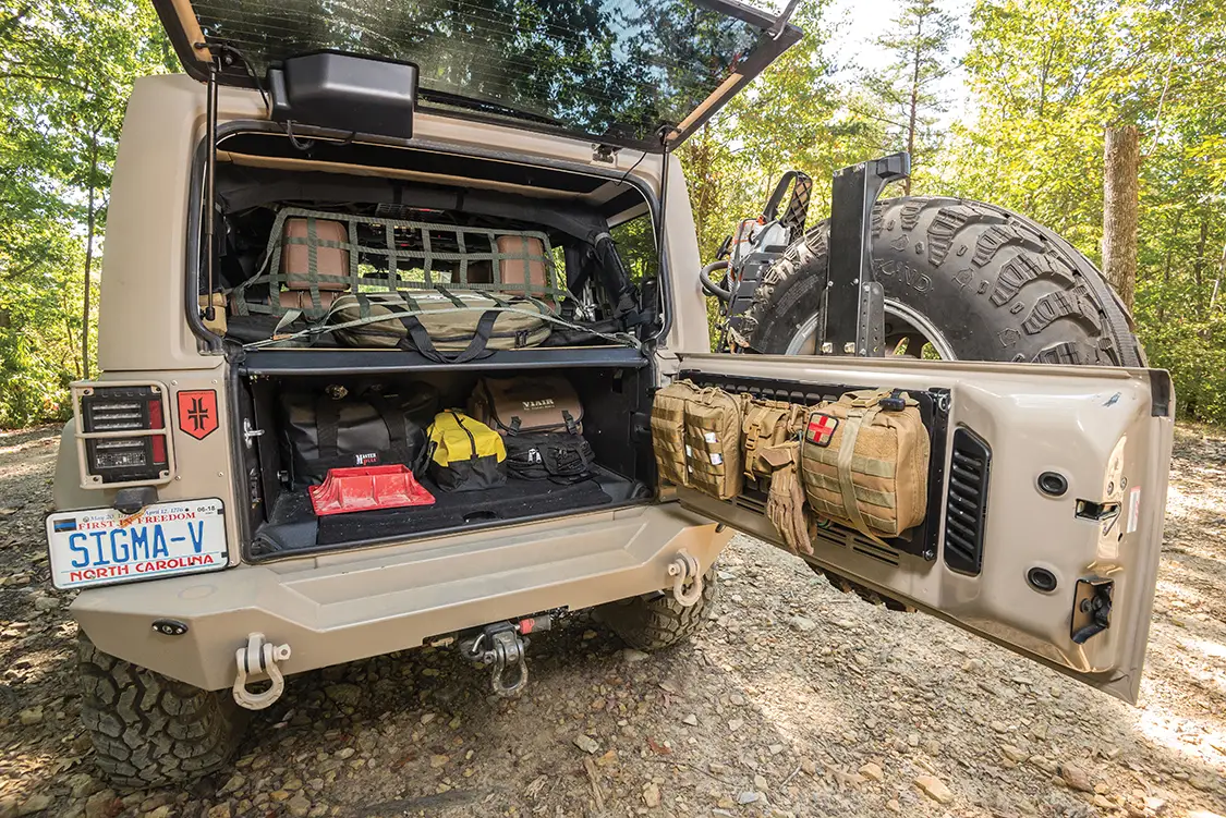 Up next Dominating Trails in a 1977 Pinzgauer 712K Published on January 13, 2026 Author Bryon Dorr Photo Credit BRYON DORR Share article Facebook 0 Twitter 0 Mail 0 A Daily-Driven Emergency Response Jeep JKU Daily-Driven Emergency Response JKU Sure, this Jeep JKU just looks like a super-clean military themed build, but there is SO much more than meets the eye! The attention to detail, especially when it comes to functionality on this vehicle, is second to none. Al DeOrleans built this impressive Jeep as a daily driver, family wheeler/overland vehicle, emergency response vehicle, to attract charity donors and eventually to be his son’s, age eight, first vehicle. DeOrleans knows a thing or two about building and using off-road vehicles around the globe, and this build is a culmination of his extensive knowledge and experience. “THE TRIED AND TRUE MOLLE PLATFORM IS UTILIZED THROUGHOUT THE JEEP, WITH ATTACHMENT POINTS ON THE REAR TAILGATE FOLD DOWN TABLE, UNIVERSAL HOLSTER MOUNT IN THE DRIVER’S FOOT WELL, DOOR POUCH MOUNTS AND FRONT AND REAR OVERHEAD PANELS.” Subscribe to our weekly newsletter DeOrleans is a volunteer for two really special organizations doing great things, and this Jeep is a big part of the work he does with them. The first, OVERT (Off-Road Vehicle Emergency Response Team), is an organization that supports first responders during extreme weather and natural disasters, making sure they can do their jobs, even if their personal or work vehicles can’t handle the extreme weather conditions. The second, US Veterans Corps, is what prompted the patriotic military look of the Jeep. The organization raises funds to help veterans in times of need. DeOrleans’s Jeep, and his impressive Hummer H3 build, are both used regularly to help attract potential donors. There is little that can stand in this Jeep’s way. Experienced This Jeep build is perfectly suited to handle just about any obstacle or weather condition that it might face, especially because DeOrleans is behind the wheel. Each and every part on this build was chosen, and many times refined, from DeOrleans’s many years of doing extreme off-road adventure competitions around the globe. The best known has to be the Camel Trophy (Patagonia), but he has also done most of the other similar style competitions as well: Rainforest Challenge (Malaysia), Outback Challenge (Australia), Croatia Trophy, Vermont Overland Trophy and the Warn Challenge (Morocco). DeOrleans has used his years of international competition, and specifically learning from all the other highly experienced teams along the way, to build the ultimate do-everything emergency-response off-road machine. Sure that’s a tall order and a major balancing act, but he has managed to pull it off to great success. Flex is something this Jeep has plenty of. It Begins This build started with a clean ‘16 Mojave Sand Jeep JKU Rubicon, with a manual transmission. Mojave Sand is a factory color that DeOrleans searched out, and then color-matched most of the parts on the Jeep in a matte version. DeOrleans has the strong conviction that automatic transmissions have no place in off-road vehicles, and also wanted his son to learn how to drive a manual for his first vehicle. The main objectives of this build were to create a super reliable vehicle that could execute both daily daddy duties as well as emergency response ones with equal ease. It was never meant to be a heavy-duty rock crawler or competition rig, as DeOrleans already has a fully built Hummer H3 on ProRock 60s and 40-inch IROKs for those purposes. It’s pretty impressive how every component on this Jeep is protected from impact. Armor protects just about every part. Down to Business With reliability and capability, the top orders of business for this build, DeOrleans made sure to first tackle the Jeep’s known weak-nesses. He first upgraded things like the steering system, ball joints and axels—even though the Jeep comes with Dana 44s, the factory ones are known to be quite weak. Because of this, DeOrleans plans to limit his tire size to 35 inches, has gusseted and sleeved the axels and upgraded the drive shafts, mainly to handle the extra weight of recovery gear and emergency supplies. In order to fit the larger tires, improve ground clearance and handle all the extra weight, a Teraflex lift kit was fitted, consisting of a LCG Long Arm Kit, 3-inch Outback springs and Fox 2.5-inch internal bypass shocks. To protect the Jeep even further, especially for those off-road obstacles that inevitably sneak up on you, Fox hydraulic bumpstops were grafted into the framerails. Hutchinson dual beadlock wheels are wrapped in super aggressive Interco IROK ND tires. This combination is perfect for running extreme low psi in order to tackle even the toughest trails. Up Armored Another key component of reliability is durability, and DeOrleans has addressed this with a plethora of quality and highly tested armor components throughout the vehicle. The under-carriage is protected with a range of Off-Road Evolution armor, which is both minimalist and highly functional. DeOrleans has learned that big heavy full coverage skid plates accumulate debris and don’t let air circulate to vital components, so while everything is protected the armor that he chose still allows fresh air to cool hot parts. It’s pretty impressive just how protected from impact every component on this Jeep is— engine skid plate, manual trans skid plate, evap skid plate, trans cross member exhaust skid plate, fuel tank skid plate, control arm skids, diff skids, blocker beam skid, rock sliders, light protectors and rear corner protectors—all from a mix of trusted quality brands. Compact fitted Warn Rock Crawler front and rear bumpers provide quality protection and recovery points, while improving approach and departure angles. Even the fenders and fender wells have been upgraded, with River Raider 2-inch metal fenders and Crawler Concepts aluminum fend