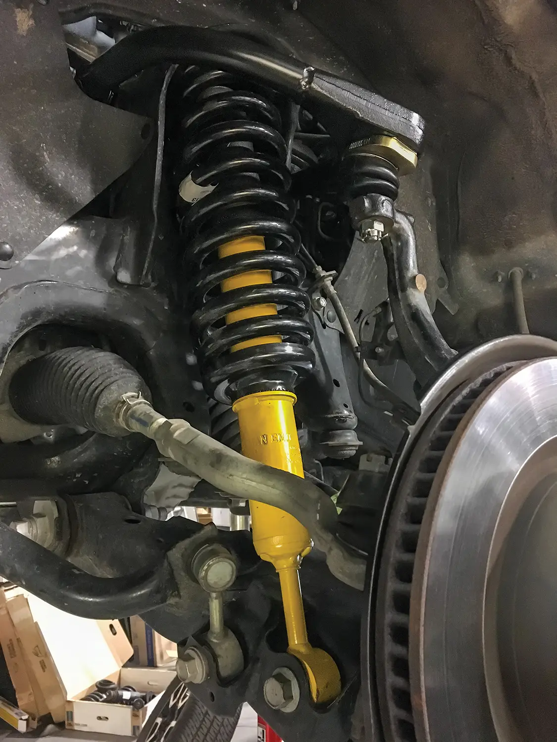 A 2.5-inch lift from Old Man Emu was fitted, in order to gain some ground clearance and allow full articulation of the new 35-inch tires under the truck. The lift kit uses OME Nitrocharger Sport mono-tube shocks and custom rear leaf packs, as well as SPC Performance adjustable upper control arms.