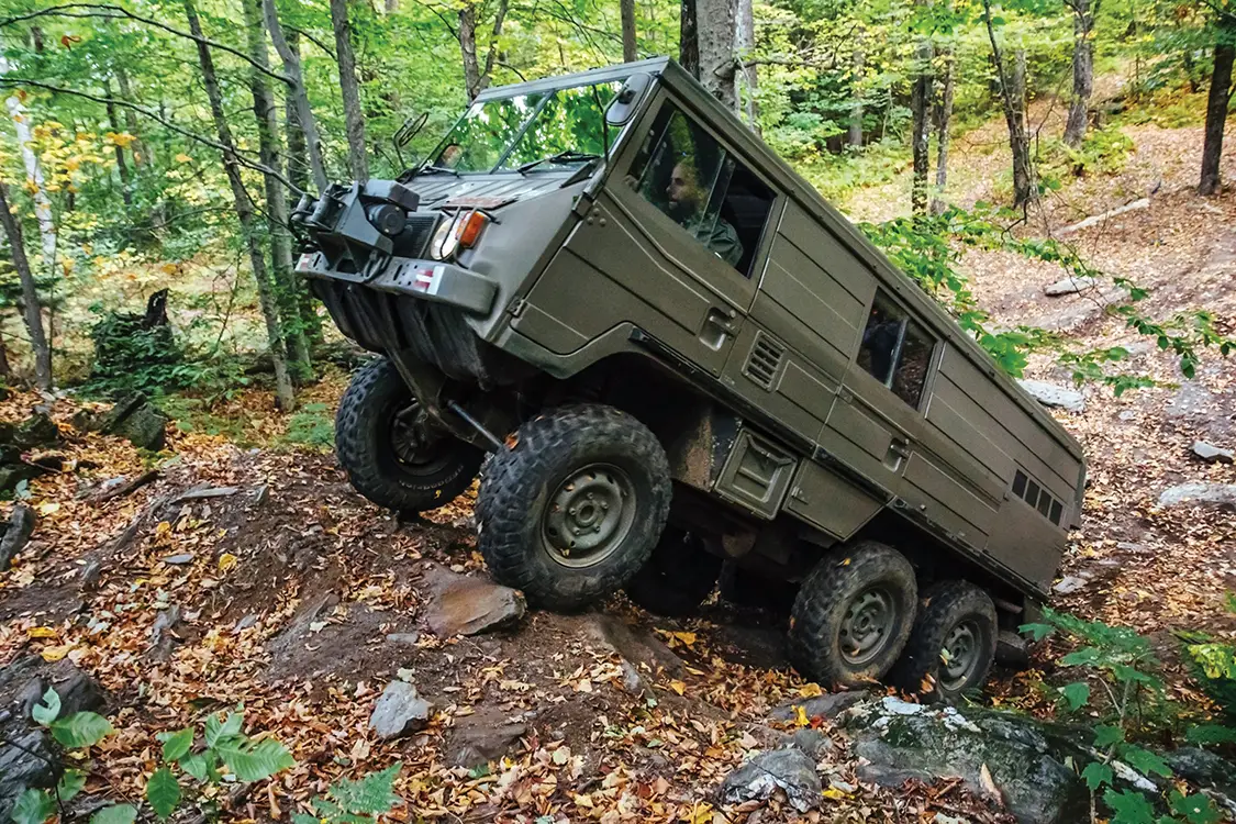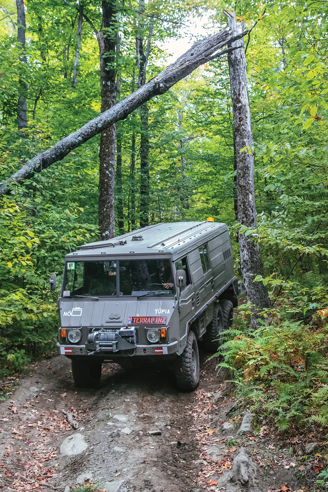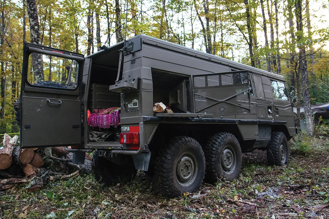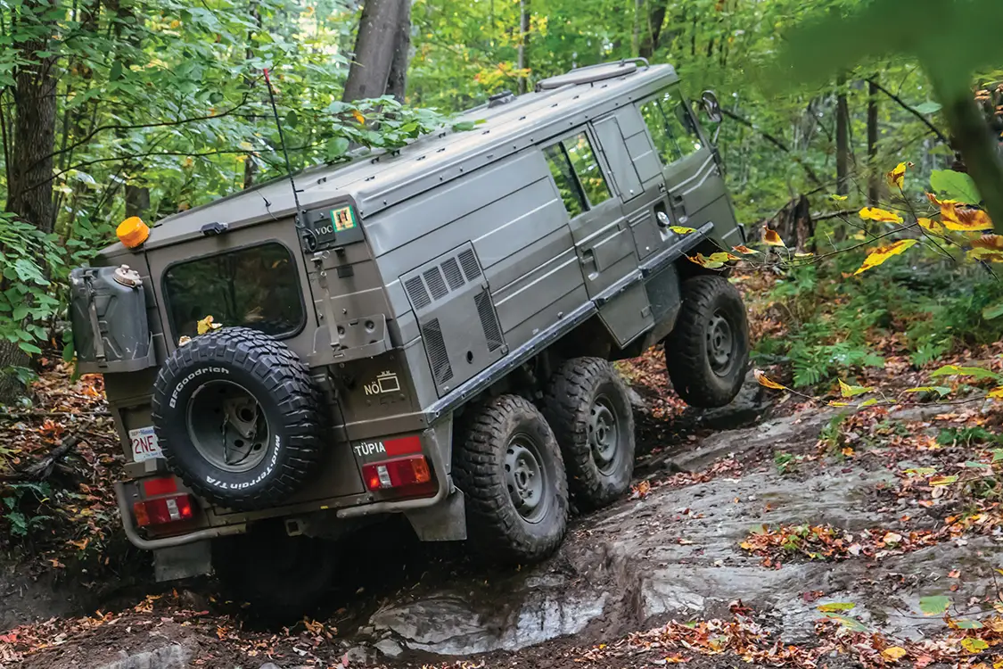 Published on January 14, 2026 Author Joshua Elzey Photo Credit JOSHUA ELZEY Share article Facebook 0 Twitter 0 Mail 0 Dominating Trails in a 1977 Pinzgauer 712K Dominating Trails in a ‘77 PINZGAUER 712K Brady Horrace is used to four-wheel-drive VW buses like the Vanago Syncro, however, they were never really designed to do the level of off-roading that he was pushing them to do. Besides, in today’s market, they were getting really expensive to buy and maintain. Horrace decided it was time to find something more capable than a VW bus, but he still wanted something somewhat unique, which took out the usual off-road suspects, such as Jeeps and Toyotas, from his choices. He remembered that he had run across the Pinzguaer sometime ago, and it now looked like the vehicle he was itching for. He did some more research on them only to discover a company in California called Expedition Imports had the answer. The company specializes in importing surplus military vehicles and parts to the U.S., such as Unimogs, Mercedes G-wagons and the Pinz. “IT WASN’T A ROCK CRAWLER OR OVER- LAND-TYPE VEHICLE MUD BUGGY, BUT WAS A SELF-CONTAINED, THAT WOULD EASILY TRAVERSE THE CLASS 4 ROADS OF NEW ENGLAND, MAKING IT EXACTLY WHAT HE WANTED IN A VEHICLE.” Subscribe to our weekly newsletter Decommissioned military vehicles often make sense to base a build on for those looking to create their own adventure rig due to their inherent ruggedness and capability. After looking up Expedition Imports on the Internet, Horrace discovered that according to the company’s website, they had several recently decommissioned Austrian Pinz’s readily available. What luck! Horace placed a call to them, as well as to his bank to see if a loan could be provided. Although he was given a funny look, the bank came through a week later to his surprise. He would eventually purchase the 712K version of the Pinzgauer after discussing its options with Expedition Imports. At first, Horrace wanted the four-wheel version of the Pinz, but found out it was actually a foot shorter than a VW bus. The six-wheel version, on the other hand, measured about 16 feet long, making it a foot longer than the VW Syncro. Looks were certainly deceiving. The Pinz was bigger, more robust, and cheaper than the VW bus. The interior had many written placards, labels, and the like, all written in German. Before sealing the deal, Horrace reached out to a good VW buddy, John, who is also a pilot. John mentioned he would be in the area soon and could stop by to take a look at the Pinzs in person. It wasn’t long before Horrace was advised by John that the Pinz was a must buy. John also informed Horrace that they were all available for purchase except for the white one. Horrace inquired why the white one wasn’t for sale just to find out that John had bought it for himself on the spot! Fired up with the good news, Horrace reached out to Expedition Imports to purchase the ‘77 712K (a more common hard-topped body type) with approximately 37 kilometers on it. It wasn’t a rock crawler or mud buggy, but was a self-contained, overland-type vehicle that would easily traverse the Class 4 roads of New England, making it exactly what he wanted in a vehicle. The next step was to get a shipper to actually send the military vehicle his way. Most shippers freaked out about the Pinz’s perceived “size” when in actuality, it wasn’t any bigger or heavier than a Ford F150. He eventually convinced a transporter to give his Pinz the ride eastward. Being a ‘77 model meant it is a first generation model and actually the very first year the highly mobile military utility 6WD Pinzguaer was manufactured. The Pinzgauer was named after an Austrian breed of horse and manufactured in Graz, Austria, by Steyr-Daimler-Puch. Produced until 2000, the Pinz would be used by militaries around the world, thanks to it being one of the most capable all-terrains available. Decommissioned military vehicles often make sense to base a build on for those looking to create their own adventure rig. They tend to be off-road capable, able to handle heavy loads and are generally easy to maintain. The Pinz hits all the marks as it was designed to be a reliable and easy to fix in the field. Most shippers freaked out about the Pinz’s perceived “size” when in actuality, it wasn’t any bigger or heavier than a Ford F150. An air-cooled duel-Zenith carb engine was specifically designed for the Pinz, giving 105 hp. The 2.5L inline 4-cylinder engine has more than one pump leading to it ensuring that it will not be starved of oil, no matter what the vehicle’s orientation is. Because its air intake sits as high as its fuel filler, the Pinz can also drive through an impressive depth of 3.5 to 4 feet of water. The engine sits within a tube chassis with fully independent suspension propelled forward by a 5-speed transmission with a low mounted 2-speed transfer case that assists in keeping the center of gravity fairly low. The 6WD-system utilizes integrated differentials and on-the-fly hydraulic locks by three levers located on the driver’s console. Three passenger-side wheels are about two inches forward of the three driver-side wheels because they each have their own ring and pinion. The extra two wheels added to the standard 4WD layout provide optimal traction for extreme situations, but also increase towing ability as well as for off-road requirements, which was what Horrace was looking for. The Pinzguaer would be used by militaries around the world, thanks to it being one of the most capable all-terrains available. The Pinz is not the fastest on the highway, topping out at 60 mph on paved roads, however during the Vermont Overland Rally, it was much faster traversing unmaintained roads than other overland-type vehicles. For Horrace, the fun isn’t about the speed at which you get to your destination, it’s about the journey and enjoying where you are at along the way. The Pinz Horrace received