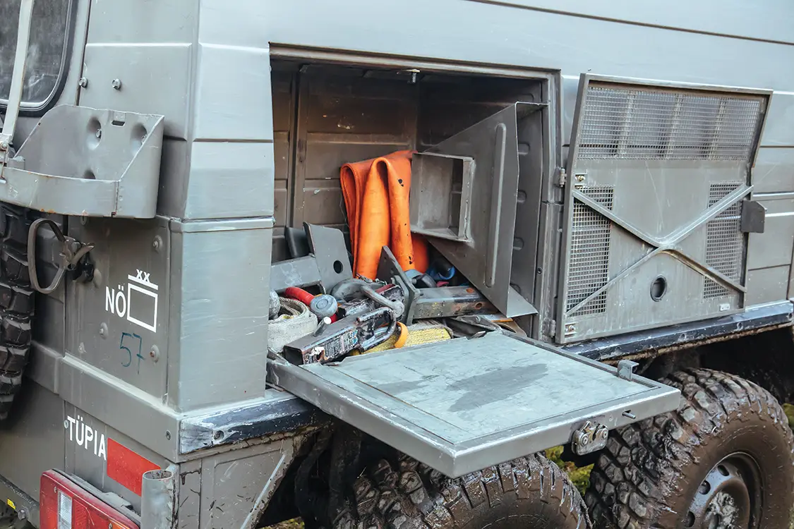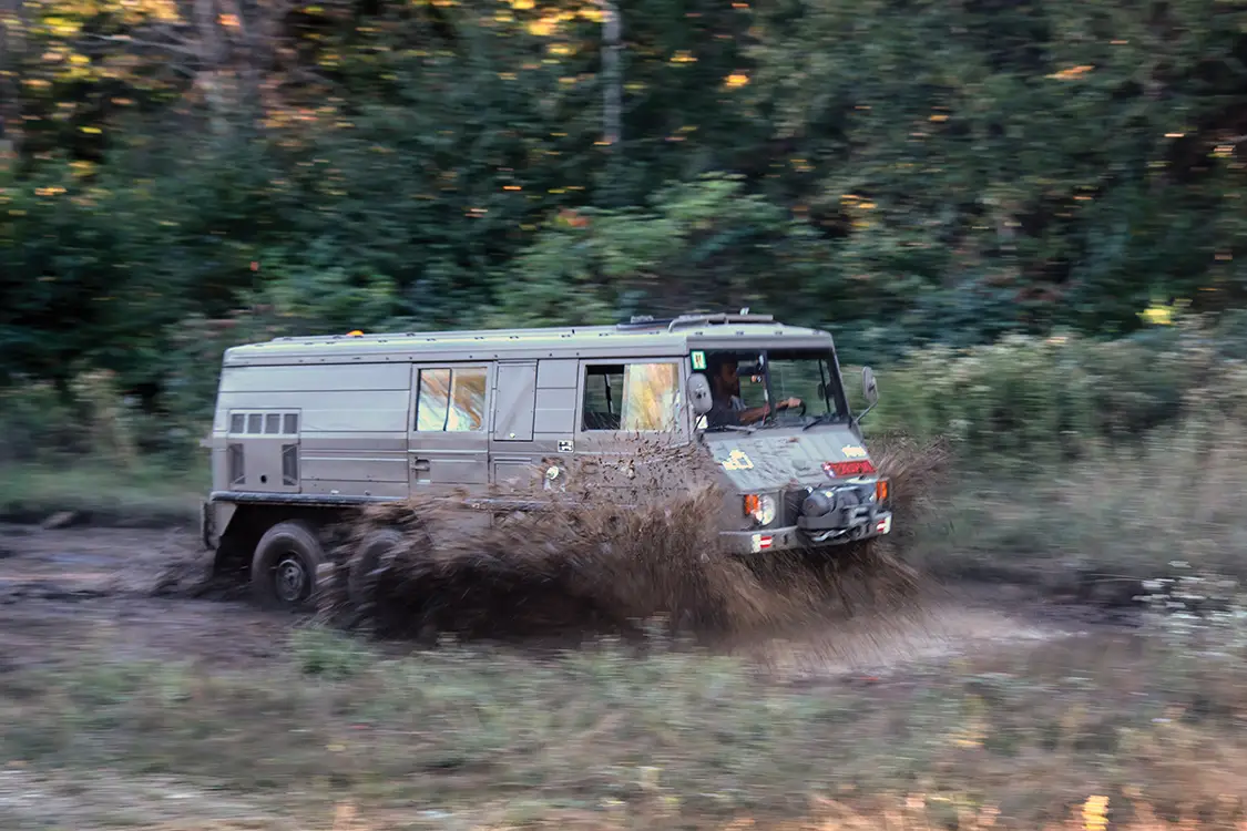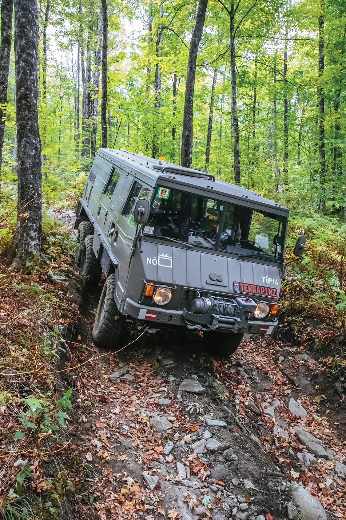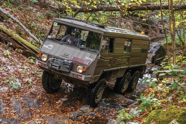 Published on January 14, 2026 Author Joshua Elzey Photo Credit JOSHUA ELZEY Share article Facebook 0 Twitter 0 Mail 0 Dominating Trails in a 1977 Pinzgauer 712K Dominating Trails in a ‘77 PINZGAUER 712K Brady Horrace is used to four-wheel-drive VW buses like the Vanago Syncro, however, they were never really designed to do the level of off-roading that he was pushing them to do. Besides, in today’s market, they were getting really expensive to buy and maintain. Horrace decided it was time to find something more capable than a VW bus, but he still wanted something somewhat unique, which took out the usual off-road suspects, such as Jeeps and Toyotas, from his choices. He remembered that he had run across the Pinzguaer sometime ago, and it now looked like the vehicle he was itching for. He did some more research on them only to discover a company in California called Expedition Imports had the answer. The company specializes in importing surplus military vehicles and parts to the U.S., such as Unimogs, Mercedes G-wagons and the Pinz. “IT WASN’T A ROCK CRAWLER OR OVER- LAND-TYPE VEHICLE MUD BUGGY, BUT WAS A SELF-CONTAINED, THAT WOULD EASILY TRAVERSE THE CLASS 4 ROADS OF NEW ENGLAND, MAKING IT EXACTLY WHAT HE WANTED IN A VEHICLE.” Subscribe to our weekly newsletter Decommissioned military vehicles often make sense to base a build on for those looking to create their own adventure rig due to their inherent ruggedness and capability. After looking up Expedition Imports on the Internet, Horrace discovered that according to the company’s website, they had several recently decommissioned Austrian Pinz’s readily available. What luck! Horace placed a call to them, as well as to his bank to see if a loan could be provided. Although he was given a funny look, the bank came through a week later to his surprise. He would eventually purchase the 712K version of the Pinzgauer after discussing its options with Expedition Imports. At first, Horrace wanted the four-wheel version of the Pinz, but found out it was actually a foot shorter than a VW bus. The six-wheel version, on the other hand, measured about 16 feet long, making it a foot longer than the VW Syncro. Looks were certainly deceiving. The Pinz was bigger, more robust, and cheaper than the VW bus. The interior had many written placards, labels, and the like, all written in German. Before sealing the deal, Horrace reached out to a good VW buddy, John, who is also a pilot. John mentioned he would be in the area soon and could stop by to take a look at the Pinzs in person. It wasn’t long before Horrace was advised by John that the Pinz was a must buy. John also informed Horrace that they were all available for purchase except for the white one. Horrace inquired why the white one wasn’t for sale just to find out that John had bought it for himself on the spot! Fired up with the good news, Horrace reached out to Expedition Imports to purchase the ‘77 712K (a more common hard-topped body type) with approximately 37 kilometers on it. It wasn’t a rock crawler or mud buggy, but was a self-contained, overland-type vehicle that would easily traverse the Class 4 roads of New England, making it exactly what he wanted in a vehicle. The next step was to get a shipper to actually send the military vehicle his way. Most shippers freaked out about the Pinz’s perceived “size” when in actuality, it wasn’t any bigger or heavier than a Ford F150. He eventually convinced a transporter to give his Pinz the ride eastward. Being a ‘77 model meant it is a first generation model and actually the very first year the highly mobile military utility 6WD Pinzguaer was manufactured. The Pinzgauer was named after an Austrian breed of horse and manufactured in Graz, Austria, by Steyr-Daimler-Puch. Produced until 2000, the Pinz would be used by militaries around the world, thanks to it being one of the most capable all-terrains available. Decommissioned military vehicles often make sense to base a build on for those looking to create their own adventure rig. They tend to be off-road capable, able to handle heavy loads and are generally easy to maintain. The Pinz hits all the marks as it was designed to be a reliable and easy to fix in the field. Most shippers freaked out about the Pinz’s perceived “size” when in actuality, it wasn’t any bigger or heavier than a Ford F150. An air-cooled duel-Zenith carb engine was specifically designed for the Pinz, giving 105 hp. The 2.5L inline 4-cylinder engine has more than one pump leading to it ensuring that it will not be starved of oil, no matter what the vehicle’s orientation is. Because its air intake sits as high as its fuel filler, the Pinz can also drive through an impressive depth of 3.5 to 4 feet of water. The engine sits within a tube chassis with fully independent suspension propelled forward by a 5-speed transmission with a low mounted 2-speed transfer case that assists in keeping the center of gravity fairly low. The 6WD-system utilizes integrated differentials and on-the-fly hydraulic locks by three levers located on the driver’s console. Three passenger-side wheels are about two inches forward of the three driver-side wheels because they each have their own ring and pinion. The extra two wheels added to the standard 4WD layout provide optimal traction for extreme situations, but also increase towing ability as well as for off-road requirements, which was what Horrace was looking for. The Pinzguaer would be used by militaries around the world, thanks to it being one of the most capable all-terrains available. The Pinz is not the fastest on the highway, topping out at 60 mph on paved roads, however during the Vermont Overland Rally, it was much faster traversing unmaintained roads than other overland-type vehicles. For Horrace, the fun isn’t about the speed at which you get to your destination, it’s about the journey and enjoying where you are at along the way. The Pinz Horrace received