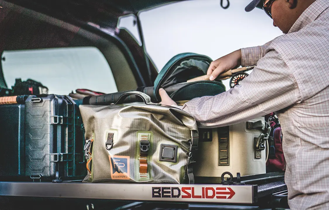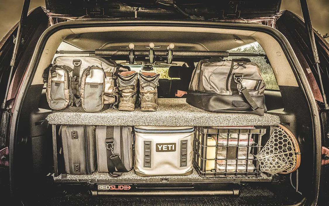 Published on December 09, 2025 Author RANDY HYNES Photo Credit RANDY HYNES Share article Facebook 0 Twitter 0 Mail 0 Turn Your Full-Size Vehicle Into the Ultimate Fishing Rig A Mix of DIY and Aftermarket Accessories Can Turn Your Full-Size Vehicle Into The Ultimate Fishing Rig The sound of tree limbs clawing across paint and sheet metal filled the truck with a sound that was both deafening and nerve-racking. The overgrowth along the narrow trail slapped the windows with a vengeance. Mud splattered across the windshield as the tires spun their way through the soft earth. Its rockers were rusted, the paint severely scratched. The windshield looked like a spider web, but when in 4WD, the truck never failed to travel where the air was fresh and the streams flowed clear. The state of Michigan would have said the boy driver was too young for such exploits and driving without a license was illegal, but the boy’s father thought it was important for his son to experience the outdoors—I followed my fatherly instinct. Subscribe to our weekly newsletter Much like their father, my sons don’t remember their first fishing trip, neither can they recall the first time they slept in a tent, or cooked over an open fire—the outdoors has always been their way of life. Their mom and dad, on the other hand, vividly remember the first time they transported three little ones into the mountains. There were diapers, wet wipes, trinkets to keep them occupied and a plethora of snacks to keep them fed. With three kids in tow, the days when a solitary bag and a single cooler were all that was needed to make it through the weekend had disappeared. Introducing three little boys to the joys of trout fishing meant days filled with tangled lines and countless cries from downstream, “Dad! I’m snagged!” It also meant larger than life smiles as those boys felt the tug of a trout on their fly line. Thankfully, those boys have not outgrown their love for the outdoors. Although, when three teenagers pack for a weekend fishing trip, it takes a considerable amount of room to make everyone happy. Meaning, we have to make the most out of whatever space is available and organize efficiently to make room for everyone’s fishing gear. An EarthRoamer would provide more than adequate room, but when budget prevents ownership of the ideal, you make do with what you have. Gear Storage In the ’80s, our adventure rig was a Chevy Suburban. It sported a modified bedliner for hauling, fishing and hunting gear. When accelerating or braking, everything in the slippery bedliner would slide to where you didn’t want it to go. For today’s outdoors enthusiast, organizing gear in a full-size vehicle has become easier than ever before. There are myriad of drawer and slider systems on the market that make organization a breeze. We chose the BEDSLIDE S for our full-size application and modified it to accommodate all the gear we take on our fishing trips. By removing the third seat of the Suburban, the BEDSLIDE S fits snug and fills the entire cargo area resulting in minimal wasted space. With a 1,000-lb. weight capacity, the slide is more than adequate to handle all of our fishing and emergency/recovery gear. “FOR TODAY’S OUTDOOR ENTHUSIAST, ORGANIZING GEAR IN A FULL-SIZE VEHICLE HAS BECOME EASIER THAN EVER BEFORE. THERE ARE MYRIAD OF DRAWER AND SLIDER SYSTEMS ON THE MARKET THAT MAKE ORGANIZATION A BREEZE.” Dad always said people who didn’t pack a shovel and recovery gear were crazy. Or, maybe it’s the people who go to places that require a shovel and recovery gear who are crazy? Either way, the aluminum frame of the BEDSLIDE S offered a place to mount a shovel, axe, Ultimate Echo-Sigma Trauma Kit and four-way lug wrench. We fabricated a simple rack to keeps these essentials out of the way yet make for quick access. Also located at the front of the slider are two Rigid storage boxes that hold enough tools to make major repairs. A plywood storage shelf was added to the top of the BEDSLIDE S giving us plenty of extra storage. Whether it’s a soft-sided cooler, rod case or camera gear, each piece fits securely in its place. For longer trips, an ARB 50 quart fridge/freezer would be a welcomed addition. For the outdoorsman who traverses both highway and backroad, the Toyo Open Country R/T tire offers exceptional performance, no matter the conditions. On the Ground Somewhere around 1927, my grandfather limped an old Ford across rough Michigan roads to spend time in the woods. Each time I hear the story, he includes a notation: In those days, flat tires were expected and repairs plentiful. It’s no secret that tires have evolved since the ’20s and now provide specific designs that meet the needs of those who spend more time on dirt than asphalt. Our choice for the full-size Chevy was the Toyo Open Country R/T series. With its rugged design, tough-looking aesthetics and all-terrain features, the R/T was just what we needed for the mix of weather and terrain we encounter. After two years of traveling in rain, snow, ice, mud, two-tracks, and highway, we have no complaints with the Open Country R/T. For the outdoorsman who traverses both highway and backroad, the Toyo R/T offers exceptional performance no matter what the conditions. While most of our off-road driving does not require a 6-inch lift, we did install the Bilstein 5100 Series Adjustable Height Shocks to provide better handling and additional spacing to squeeze the Toyos in the Chevy’s narrow wheel wells. To ensure proper caster, camber and overall alignment, the factory upper control arms were replaced with a set of beefier Zone Offroad upper control arms. This added feature provides proper geometry, replaceable ball joints, and a sure fix to ball joint binding issues. “THANKFULLY, THOSE BOYS HAVE NOT OUTGROWN THEIR LOVE FOR THE OUTDOORS. ALTHOUGH, WHEN THREE TEENAGERS PACK FOR A WEEKEND FISHING TRIP, IT TAKES A CONSIDERABLE AMOUNT OF ROOM TO MAKE EVERYONE HAPPY.” 