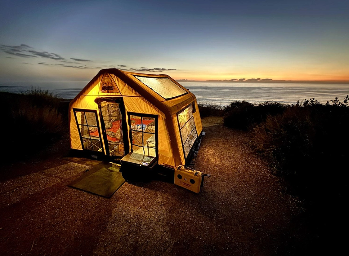 Up next Exploring the World in a Crew Cab Diesel: KP Pawley’s Overlanding Rig for Full-Time Adventure Published on October 17, 2024 Author Tread Staff Tags Air Tent, Best Inflatable Tent, Best Inflatable Tents, Blow Up Tent, Inflatable Camping Tent, Inflatable Tent for Camping, Inflatable Tents, Share article Facebook 0 Twitter 0 Mail 0 Inflatable Tents vs. Traditional Tents: A Comprehensive Comparison By Alex Schult, founder, 4WDTalk My first camping trip was in the mid-1970s with my family in upstate New York. I distinctly remember the chill of the air in the Inflatable tent at night, the smell of the trees, and the feeling of the dirt between my fingers as my brother and I played in the forest around our camp. It was so much fun – and I remember it vividly 40-something years later! That trip – and many others after it – instilled in me a love of the outdoors. That passion has stuck with me throughout my life, and is something I’m passing on to my son now. It’s also a passion that led me to found 4WDTalk a few years back. If you’re going to work, it might as well be in a field you love! Since founding 4WDTalk, I’ve tested a lot of tents – traditional ground tents, rooftop tents, hard-sided tents, hot tents – you name it. But in the last couple of years, I’ve focused more on field testing inflatable tents. Subscribe to our weekly newsletter Inflatable tents, like my Sonmez London Maxia 480, are absolutely huge. These tents have become wildly popular in recent years, and for good reason. As I’ll explain below, inflatable tents have a host of features that make them easy to use and incredibly functional. But, as with any outdoor gear, it’s not all sunshine and roses. Thus, the debate about inflatable tents – do the advantages outweigh the disadvantages enough to make them a worthy option? Here are a few things I’ve learned – both good and bad – that will help you determine if buying an inflatable tent is worth your hard-earned cash. Advantages of Inflatable Tents Inflatable tents, like my Sonmez London 360 Discover, are easy to set up. At the top of my list of advantages of these tents is the ease of setup. Unlike traditional tents with poles that somehow always manage to get caught on something, inflatable tents merely need air to take their shape. It’s a three-step process, really: Lay out a tarp, ground cloth, or tent footprint. Lay out the tent. Start pumping! Now, I highly recommend using an electric pump and a power station to do most of the inflation. I use a cheap pump I got on Amazon and power it with a Goal Zero 1500x. Just about any combination of pump and power source will work here, though. I have found that the pump struggles toward the end due to the high pressure in the tent. So, I use a manual pump to finish inflating the tent and get the correct PSI. Invest in a good pump and power source to take care of inflating your tent. The time required to inflate one of these tents varies based on size, of course, but it’s generally a matter of a few minutes. While the electric pump does its thing, I can concentrate on getting other gear loaded and get two things done at once. Related to this is the ease of deflating the tent; it’s a simple matter of opening valves to start the process. Again, I can tend to other tasks while the tent deflates, then help it out toward the end by carefully compressing the chambers to force the remaining air out. I’ve found there to be many other benefits of inflatable tents, too… Inflatable Tents are Comfortable My son showing off the three rooms inside one of our inflatable tents. I’ve done a lot of camping in tents recently, and I have to say they provide a more comfortable space for hanging out and sleeping than any traditional tent or rooftop tent I’ve tested. A big part of this is the sheer amount of space – some of these tents are 100 sq. ft. or more, so you have plenty of room to spread out. Heck, one of my inflatable tents, the Sonmez London Maxia 480, has three rooms! When you’re like me and you often have to work while you’re camping or overlanding, you have a lot of gear. I have the typical camping stuff, like a cot, sleeping pad, and sleeping bag. But I also have a portable table, my laptop, Starlink, a power station…you get the point. I need my tent to be my sleeping quarters, my hangout area, and my office, so the size of an inflatable tent is a huge benefit. Inflatable tents, like my RBM Outdoors Panda, offer loads of headroom. The fact that I can stand up straight in an inflatable tent is nice, too. Now that I’m in my 50s, crawling around in a pup tent or rooftop tent isn’t at the top of my list of things I want to do. But in an inflatable tent, I can roll out of bed, stand up, and stretch with ease. I’ll add another comfort feature to the list – tons of windows. Again, while every tent is different, most of the ones I’ve tested have had huge windows that make the tent light, bright, and airy. In fact, many inflatable tents have clear panels on the roof, allowing even more natural light inside. Better still, these panels afford you a nice view of the night sky so you can sleep under the stars with the advantage of being protected from the elements. Inflatable Tents are Stable The guy lines on my RBM Outdoors Panda inflatable tent provide added stability. If you’ve never camped with an inflatable tent, I don’t blame you for questioning how they hold up in strong winds. Visions of those dancing air tubes at used car lots are probably running through your head right now! However, once an inflatable tent is full of air, they are rock-solid. Now, tying the tent down with guy lines and stakes is an absolute must, but once that’s done, you’ll be shocked at just how stable these tents can be. In fact, I’ve camped in 50+ mph winds in an inflatable tent and was blown away (not literally!) by just how solid the tent was. I’ve also been amazed at how quiet these tents 