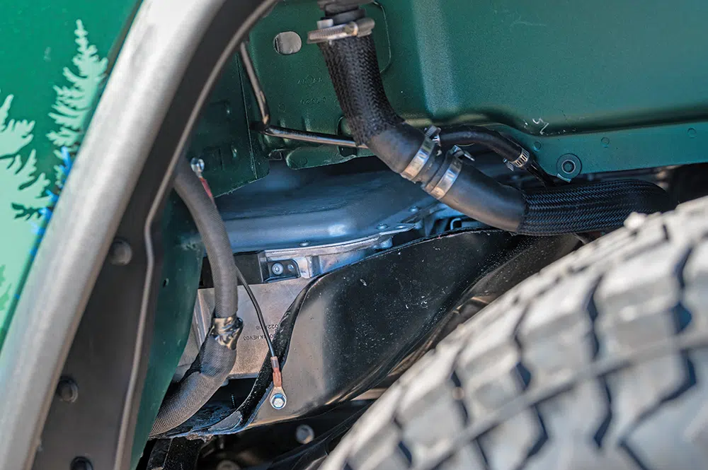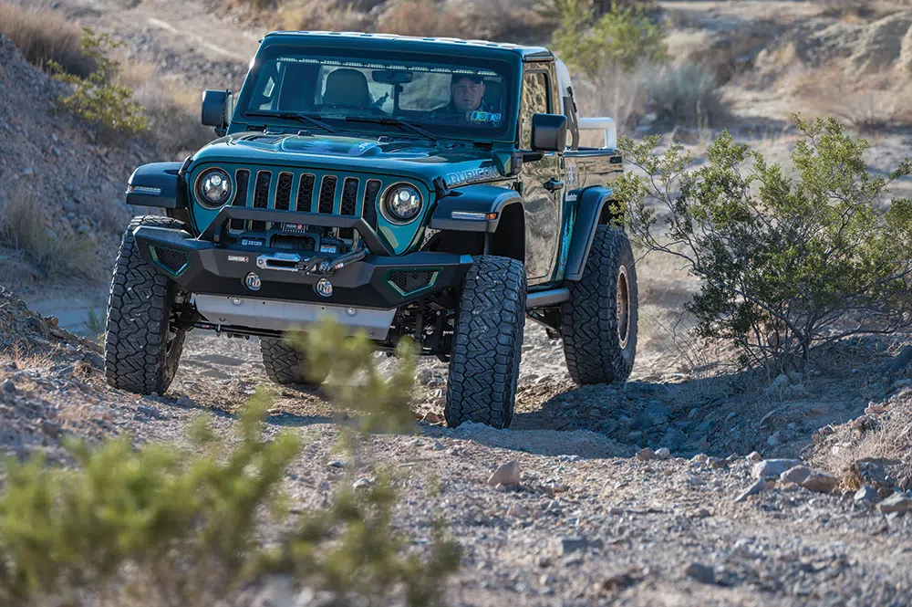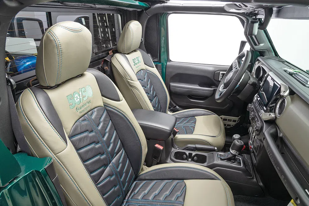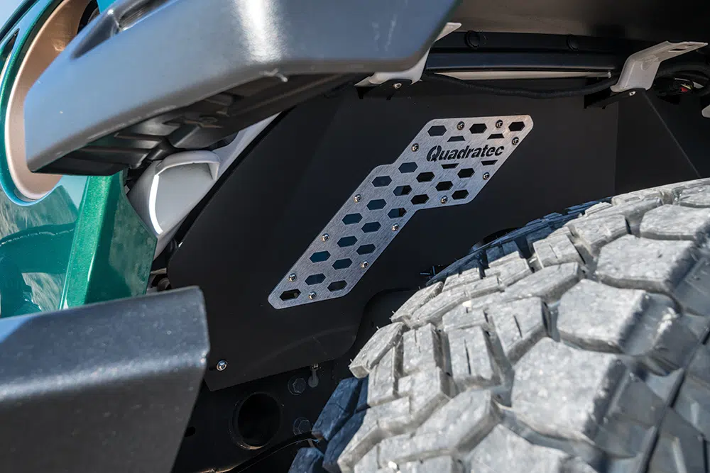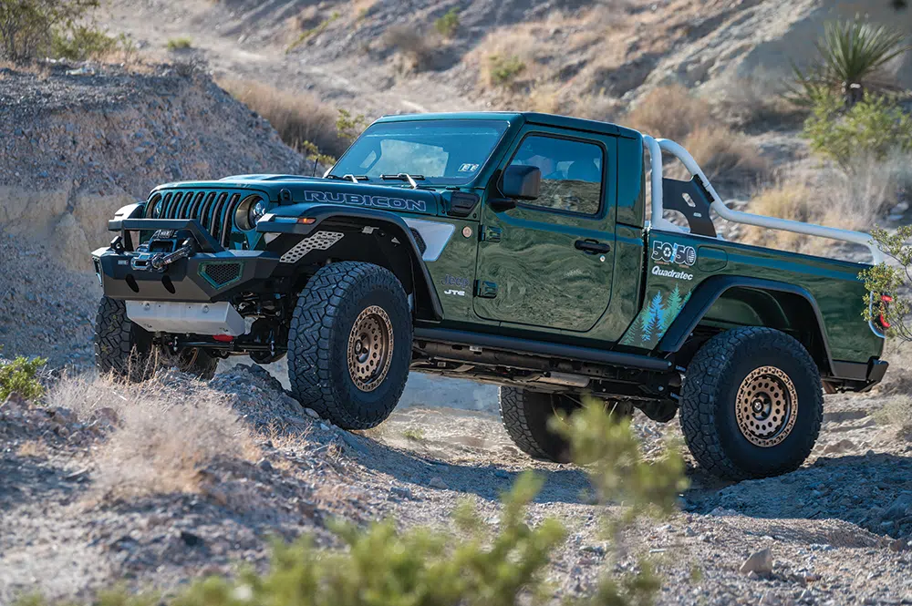 Up next Power Up Your Rig With These Accessories: Outfitted Published on April 10, 2023 Author Bryon Dorr Tags 50 for 50, Bryon Dorr, Hybrid Jeep, Jeep Gladiator, Jeep Truck, Jeep Wrangler, JTe, Quadratec, Quadratec 50 for 50, tread lightly, Unofficial Use Only, Share article Facebook 0 Twitter 0 Mail 0 Quadratec 50 for 50 JTe Single Cab Long Bed Hybrid Jeep Truck If you’re a diehard Jeep person you’ve probably dreamt about a single-cab, Wrangler-based pickup truck with a useable size bed. The Gladiator is cool, but only comes in a 4-door, short-bed configuration. Push that dreaming a bit more and the Jeep truck would be rolling on 37s, have full armor, custom paint, and a custom interior. And, if you dreamt really big, it would also have impressive fuel economy and nearly silent off-road capability. Well, Quadratec and custom Jeep fabricator Greg Henderson at Unofficial Use Only dreamt really big and created the JTe! Taking it up a notch even further on the cool scale is Quadratec’s initiative, in partnership with Tread Lightly!, for this custom dream Jeep truck to be used to clean up off-road trails across the country. Quadratec 50-for-50 What Quadratec and Henderson created is the JTe, or Jeep truck 4Xe, a single cab long bed plug-in hybrid with real off-road capabilities. The build has a 50-for-50 theme, to align with its mission with Tread Lightly of cleaning up 50 trails in 50 states over a 24-month period. What Quadratec and Henderson created is the JTe, or Jeep truck 4Xe, a single cab long bed plug-in hybrid with real off-road capabilities. Subscribe to our weekly newsletter The JTe has a full custom paint job, with accent graphics in vinyl. 50-for-50 JTe This impressive vehicle started life as a 2022 Jeep Wrangler Unlimited 4Xe Rubicon, arguably the most off-road capable Jeep to roll off the assembly line. The cab was then chopped, just behind the front doors, and the rear half removed. This impressive vehicle started life as a 2022 Jeep Wrangler Unlimited 4Xe Rubicon… The cab was then chopped, just behind the front doors, and the rear half removed. The cab was then buttoned up using all factory Mopar replacement parts. This included the rear section of the cab, roll bars, and interior panels. A hardtop from a Jeep Gladiator was modified to fit properly on this shortened cab, even retaining full functionality of the freedom panels. There are few obstacles that could stand in the way of this full outfitted PHEV Jeep. A hardtop from a Jeep Gladiator was modified to fit properly on this shortened cab, even retaining full functionality of the freedom panels. The next step was fitting a factory Jeep Gladiator bed. This required some impressive fabrication work. When aligned over the rear wheels of the Wrangler, there was a 10.5-inch gap to the newly closed off cab. Factory sheet metal provides a clean OEM look to the now custom Jeep long bed. After completing all the body work, the JTe headed off to Red’s Bodyworks for a full custom “Quadratec Green” paint job. Some vinyl graphics help tie the theme all together. Oracle flush mounted taillights and a rear winch behind the license plate are highlights at the back of the JTe. More Capability With all that custom body work and shiny paint, it was impossible to not upgrade the JTe with a full host of Quadratec products and more. The JTe rolls on 37-inch Nitto Recon Grappler A/T tires wrapped around 17-inch Lynx Trail Gunner wheels in bronze. Also, the truck bed houses a full-size spare tire. Those big meaty tires fit under the truck courtesy of a Lynx 2.5-inch suspension lift system with adjustable control arms, and work properly thanks to Steersmarts steering components. Quadratec high clearance fenders and Quadratec JL front inner fender liners also help the big tires fit properly. A full-size spare is mounted in the truck bed. Up front a Carnivore Series bumper mounts up with a 12k Res-Q winch with synthetic cable. Out back there is a modified JL Carnivore series bumper with a hidden 9k Res-Q winch, with remote solenoid mounted under the bed. The rear winch could be for recovery, but it will more likely pull trash off the trail. A Lynx 2.5-inch suspension lift enables the big tires to work properly off road. A custom Lost Canyon bed rack with Jack and Rotopax mounts completes the truck’s looks. It adds some classic style to the build, and it also adds a place to mount some chase lights. Speaking of lighting, the Quadratec JTe has a fully upgraded lighting package throughout. A Quadratec J5 50-inch lightbar mounts up behind the front windshield — a stealthy setup. The OEM headlights got an upgrade to Quadratec Premium LED Projector Series headlights. Out back, Oracle flush mounted tail lamps address one of the Gladiators most prone-to-trail-damage areas, the protruding OEM taillights. The 17-inch Lynx Trail Gunner wheels are wrapped in 37-inch Nitto Recon Grappler A/T tires. The interior is kept pretty stock, but with a few OEM+ touches. Even the headlights have been upgraded. The hybrid battery pack remains in its stock location, but instead of being under rear seats, it is now under the front of the bed. Quadratec inner fender liners help keep a tidy look and some of the dirt out of the engine bay. A Lynx 2.5-inch suspension lift enables the big tires to work properly off road. Custom Truck, Custom Interior Of course, the interior needed upgrades to match the clean OEM+ exterior and further the 50-for-50 theme. First up are custom embroidered Katskinz seat covers. To match the sand color seat accents, they painted the passenger side dash plate. Custom 3D printed lower Unofficial Use Only door storage bins fit in to the doors. To keep storage tidy in the small single-cab truck, custom Overland Outfitters storage bags fit behind the seats. A massive Alpine 9-inch multimedia restyle system dominates the dash. But, besides those tasteful updates the rest of the JTe’s interior looks factory fresh, even though much of i