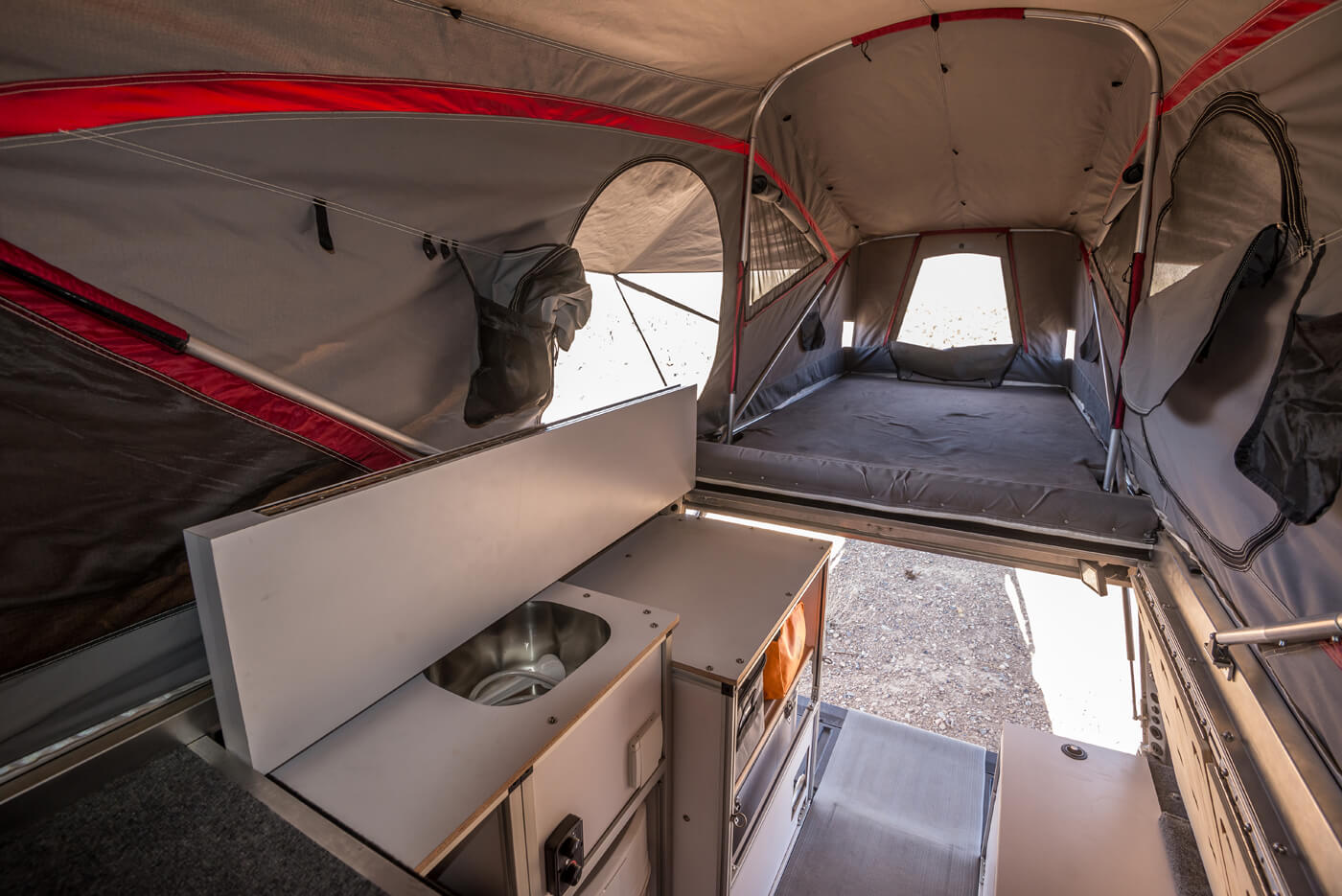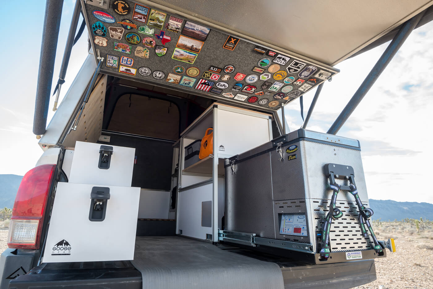 Up next Airing Down and Back Up the Right Way Published on October 09, 2017 Author Bryon Dorr Tags 2016 tacoma, at overland camper, camper shell, gear habitat, Goose Gear, goose gear habitat, Overland, overland camper, overland tacoma, Tacoma, tacoma build, tacoma overland build, Toyota, Toyota Tacoma, Share article Facebook 0 Twitter 0 Mail 0 Goose Gear Tacoma Bed Turned Cozy Habitat Innovation starts with desire, a need, and resources. Brian Fulton, owner of Goose Gear, which makes premium storage solutions for off-road adventure vehicles, wanted to get his daughter out on the trail with him to experience her own outdoor exploits. This desire spurred the need to bring the comforts of home on the road, and luckily, he had the resources to make it all come together in his custom cabinet shop. A full living-quarters system designed specifically to work on a Toyota Tacoma outfitted with an AT Overland Habitat bed-mounted shell. The pinnacle of Goose Gear’s quality offerings is a full truck bed living-quarters system that’s designed specically to work on a Toyota Tacoma outfitted with an AT Overland Habitat bed-mounted shell. The combination of the Habitat and Goose Gear’s system has all the makings to create a cozy and comfortable home on and off the road. Let’s delve deeper into the example featured here, which is actually Goose Gear’s test mule and Fulton’s personal overland adventuremobile. Subscribe to our weekly newsletter All in the Family Goose Gear got its name from Fulton’s daughter, now twelve, whom he nicknamed “Goose” when she was a baby. Fulton and his business partner Matt Hebel, who both saw their children getting older without having epic adventures with their families, founded the company to rectify that situation. After making their first drawer system for the back of Fulton’s 2007 Tacoma in only a few hours’ time utilizing CAD software and a precision CNC machine, the pair knew they were onto something. They posted a video of the CNC mill in action and some photos of the finished products and CAD lines online, which quickly garnered enthusiasm for the product, resulting in their first orders. The AT Habitat housing the Goose amenities is available for second- and third-generation Tacomas. There seemed to be a need in the overland and off-road marketplaces for high-quality custom cabinets for adventure vehicles. By using excess machine time in Fulton’s custom cabinet shop, the two businessmen were perfectly positioned to ll this need. Fueled by their initial success, Fulton sold his daily driver work truck and built out a 2004 Toyota 4Runner, both to use as a test bed for the new company and as an adventure vehicle to get his daughter out on the epic trips he had dreamed of. While the 4Runner was a great introduction to the off-road world for his daughter, Fulton realized that he needed more space and more of the comforts of home in order to keep his young daughter’s interests in traveling into the backcountry with him. A New Ride After Fulton searched far and wide for a suitable truck to base his new build on, the 2016 Toyota TRD 4×4 Tacoma became the obvious choice. He attended the public unveiling of the AT Overland Equipment Tacoma Habitat at the American Adventurist Desert Rendezvous, where he spoke in-depth with the Habitat’s designer, Mario Donovan. It was this event that really sold him on the Tacoma. Goose Gear had already assembled a number of similarly styled builds in the past, so Fulton already knew the capabilities and opportunities this type of vehicle would offer. Intro to Overlanding The videos from Expedition Overland, a Toyota-sponsored overland expedition team that puts out top-quality travel videos online, introduced Brian Fulton to the overlanding world. Expedition Overland received the test production AT Overland Tacoma Habitat for use on a big Alaskan video shoot and adventure, and chose Goose Gear to outfit the truck. The company has since become a sponsoring partner of the Expedition Overland team, and as Fulton says: “It was really awesome to go from an observer and straight to the ‘rock stars’ of the industry in such a short period of time.” The experience gained working on the Expedition Overland Tacoma gave him even more ideas of how to refine a system that would fully realize the potential of the AT Overland Tacoma Habitat system. The System This potential has come to fruition in Fulton’s personal Tacoma build, which is also the prototype for the ultimate iteration of the Goose Gear Habitat living/storage system. The system is continually being upgraded and improved, but at its core is the Goose Gear Plate System, a custom plate for the Tacoma truck bed that’s bolted to the truck featuring built-in anchors for securing Goose Gear Modules. The standard Goose Gear Habitat system is made up of four modules and the plate. The four modules consist of a refrigerator cabinet module, sink/storage module, storage cabinet module, and a double-drawer module. The fridge cabinet is installed at the rear passenger side of the vehicle and allows for refrigerator access inside and outside the rig; it has a cutting board/shelf atop the fridge unit and offers an interior countertop at standard countertop height. The four modules consist of a refigerator cabinet module, sink/ storage module, storage cabinet module, and a double-drawer module. The Goose Gear Plate system bolts to the truck and features built-in anchors for securing the Goose Gear modules Goose Gear’s folding seat design provides comfortable seating for three and allows for great views out of all the Habitat’s windows. The sink/storage module is also mounted on the passenger side of the vehicle and offers up a stainless steel sink, two upper storage shelves, and a large lower storage shelf that stores the Thetford 550P cassette toilet. Under this module there’s an area that houses a water heater, water pump, and all necessary wiring and plumbing. Th